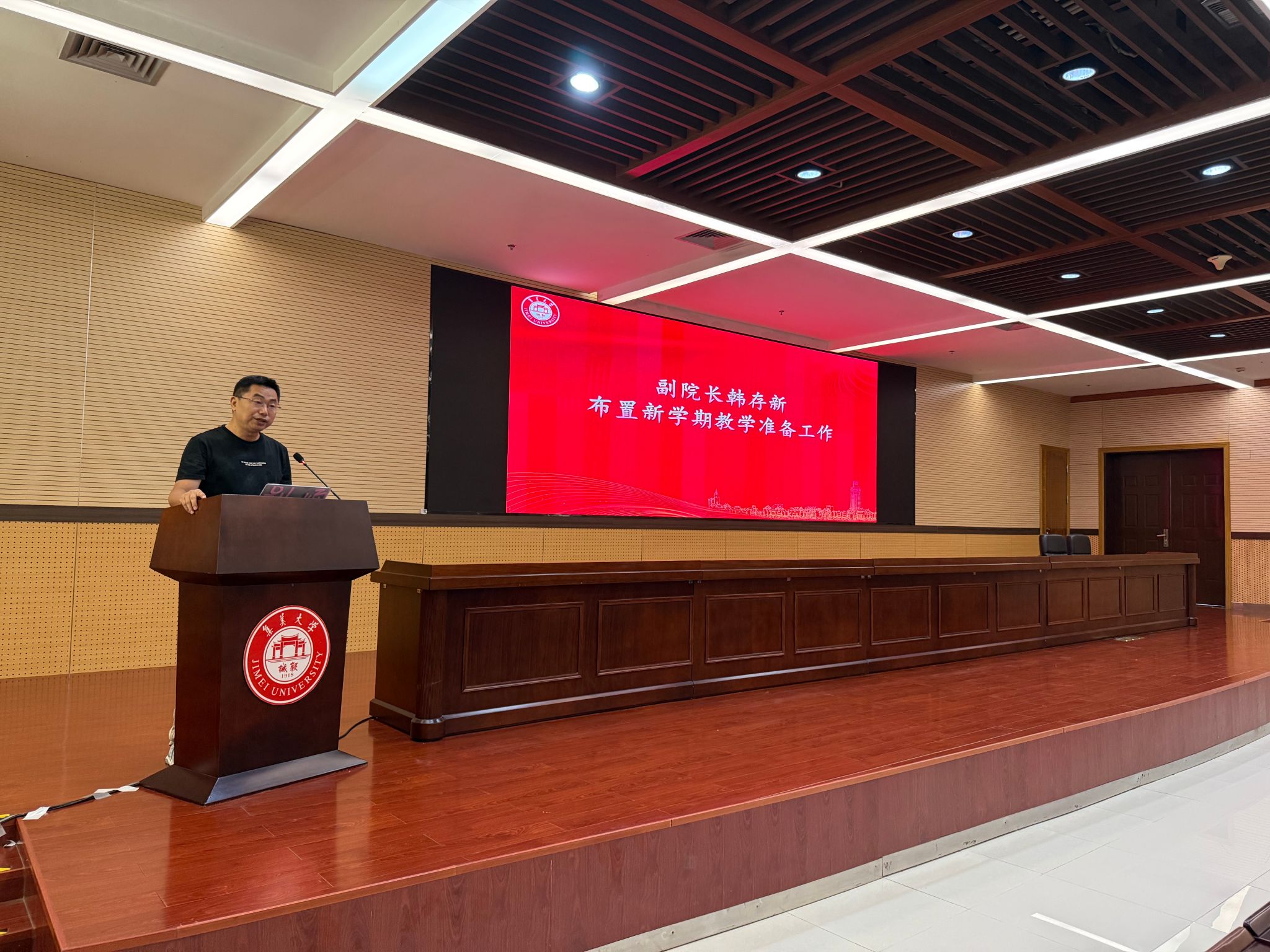副院长韩存新布置新学期教学准备工作,强调要引导新生厚植 “爱校、爱院、爱专业”情怀,叮嘱全院教师坚守规范教学要求,提升教学质量,落实好科研活动安排等事项。