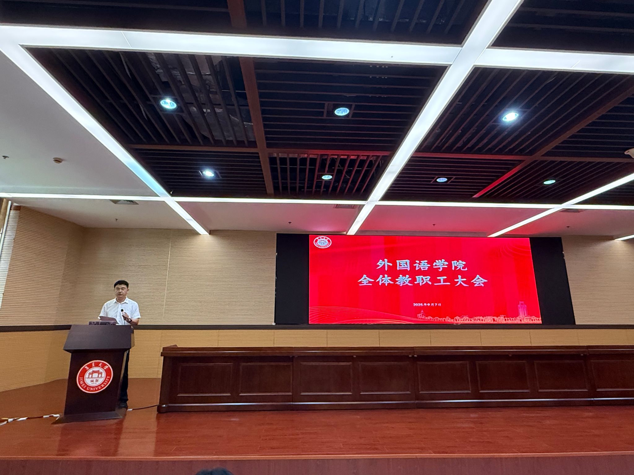 9 月 7 日,外国语学院于尚大楼 103 会议室召开新学期全院教职工大会,传达学校务虚会重要指示精神,部署新学期教学、学科建设等工作,为新学期高质量发展指明方向。