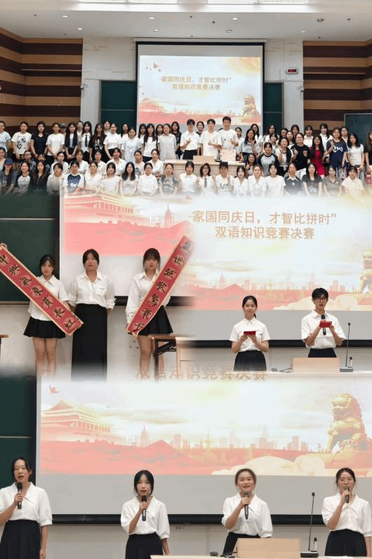60支队伍经过激烈角逐,10支队伍脱颖而出。决赛现场,题型丰富多样,内容紧密融合家国思政知识,全面考察了学生的知识储备、双语能力和团队协作精神。比赛中还穿插了诗朗诵《祖国啊,我为您自豪》、与国同庆书法展以及歌曲《我和我的祖国》等文艺表演,为比赛增添了浓厚的艺术氛围。