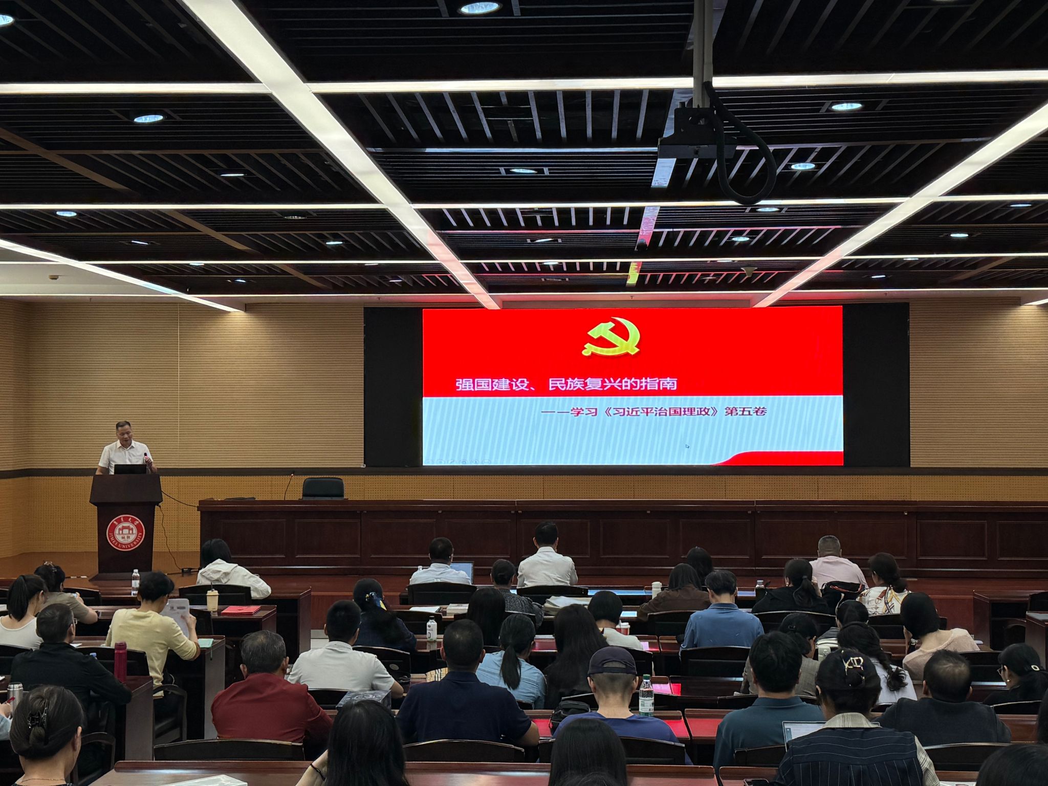 讲座中,肖仕平以《习近平谈治国理政》第五卷的出版背景与时代价值为切入点,他系统梳理了著作“以中国式现代化全面推进中华民族伟大复兴”“进一步全面深化改革”“因地制宜发展新质生产力”“开创中国特色大国外交新局面”等18个专题的核心脉络。他重点解读了“中国式现代化五大特征”“新质生产力的创新内涵”“‘两个结合’的理论突破”等关键内容,结合当前国内外发展形势与教育领域实际,阐释了著作中蕴含的马克思主义立场、观点、方法。