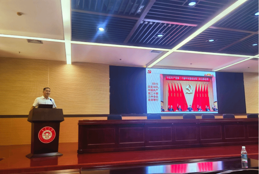 9月11日,外国语学院邀请马克思主义学院肖仕平教授作学习贯彻党的二十届三中全会精神讲座,讲座由院党委书记黄建宇主持,学院全体教职工、全体学生党员参加。