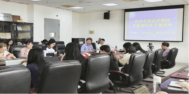 张政教授首先陈述了发表论文的原因,强调了翻译研究中追问精神与创新的重要性,认为翻译过程要敢于质疑,并借助语料库手段检验用词的合理性。随后,张教授以“bureaucracy”的英译为例,指出具有贬义的译文会引发读者不悦的联想,甚至导致译文费解、曲解和误解。最后,张教授以部分学生发表过的文章为例,深入浅出地阐述了一篇合格论文应涵括义、音、形三要素。互动环节,张政教授与在场师生就思辨能力培养、论文选题切入点等方面进行深入交流,对提高研究生及教师的学术研究能力有很大启发。