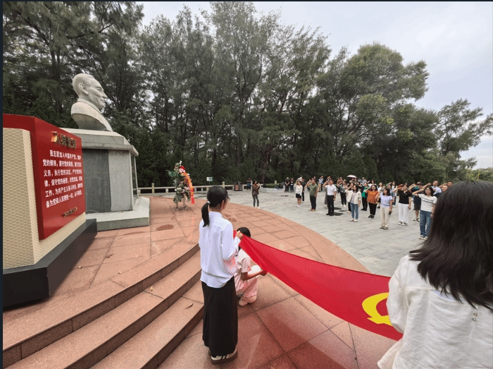 上午,师生党员来到谷文昌干部纪念馆。在讲解员的带领下,通过影像资料、实物、文字等形式,生动地再现了谷文昌同志带领东山人民植树造林、根治风沙、发展生产、兴修水利、改善交通的动人情景和不凡历程。此外,由东山县群众捐资建成的谷文昌塑像也屹立在林海间,塑像前的“绿色丰碑”四个大字闪亮醒目,直抵人心。全体党员在谷文昌塑像前敬献花篮,并在党委书记黄建宇的领誓下,重温入党誓词,表达对谷文昌同志的崇敬和缅怀之情。