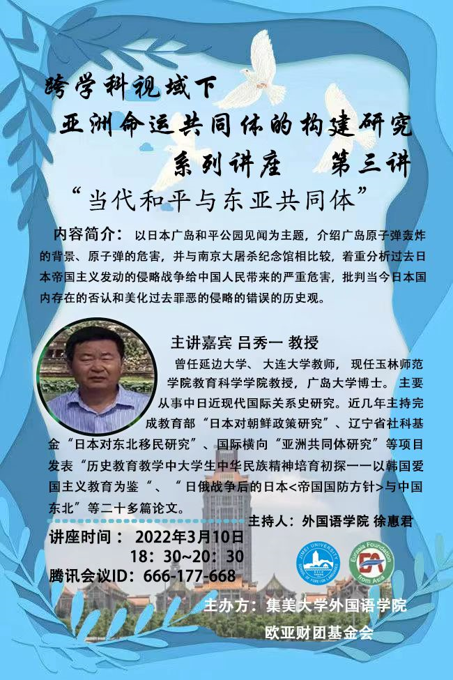 上一篇:3月10日:亚洲命运共同体的价值与意义(日本明治大学 郑俊坤教授)