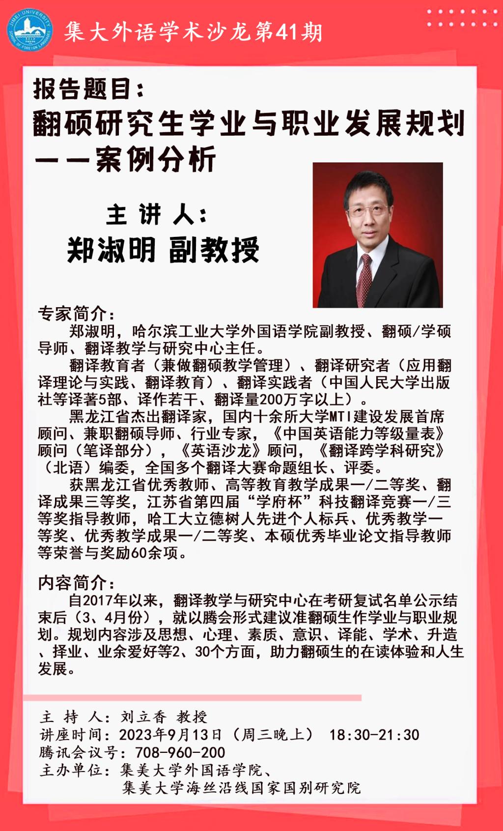 郑淑明,哈尔滨工业大学外国语学院副教授、翻硕/学硕导师、翻译教学与研究中心主任。