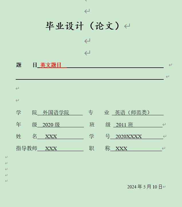 每个学生上交装订成册的毕业论文一份,A4纸单面打印。装订顺序:毕业论文封面+诚信书(姓名手签)+毕业论文(论文外文题目、摘要与关键词+中文题目、摘要与关键词+论文正文+参考文献+致谢语+附录)。请要求学生用封面包住诚信书和论文,然后去打印店胶装(答辩后确认论文无误再去胶装,胶装封面统一使用学院分发的黄色封面)。胶装封面填写参考下表,2011和2012班的专业写“英语(师范类)”,2013和2014班的专业写“英语”。日期统一写“2024年5月10日”