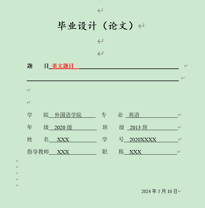 每个学生上交装订成册的毕业论文一份,A4纸单面打印。装订顺序:毕业论文封面+诚信书(姓名手签)+毕业论文(论文外文题目、摘要与关键词+中文题目、摘要与关键词+论文正文+参考文献+致谢语+附录)。请要求学生用封面包住诚信书和论文,然后去打印店胶装(答辩后确认论文无误再去胶装,胶装封面统一使用学院分发的黄色封面)。胶装封面填写参考下表,专业写“翻译”。日期统一写“2024年5月10日”