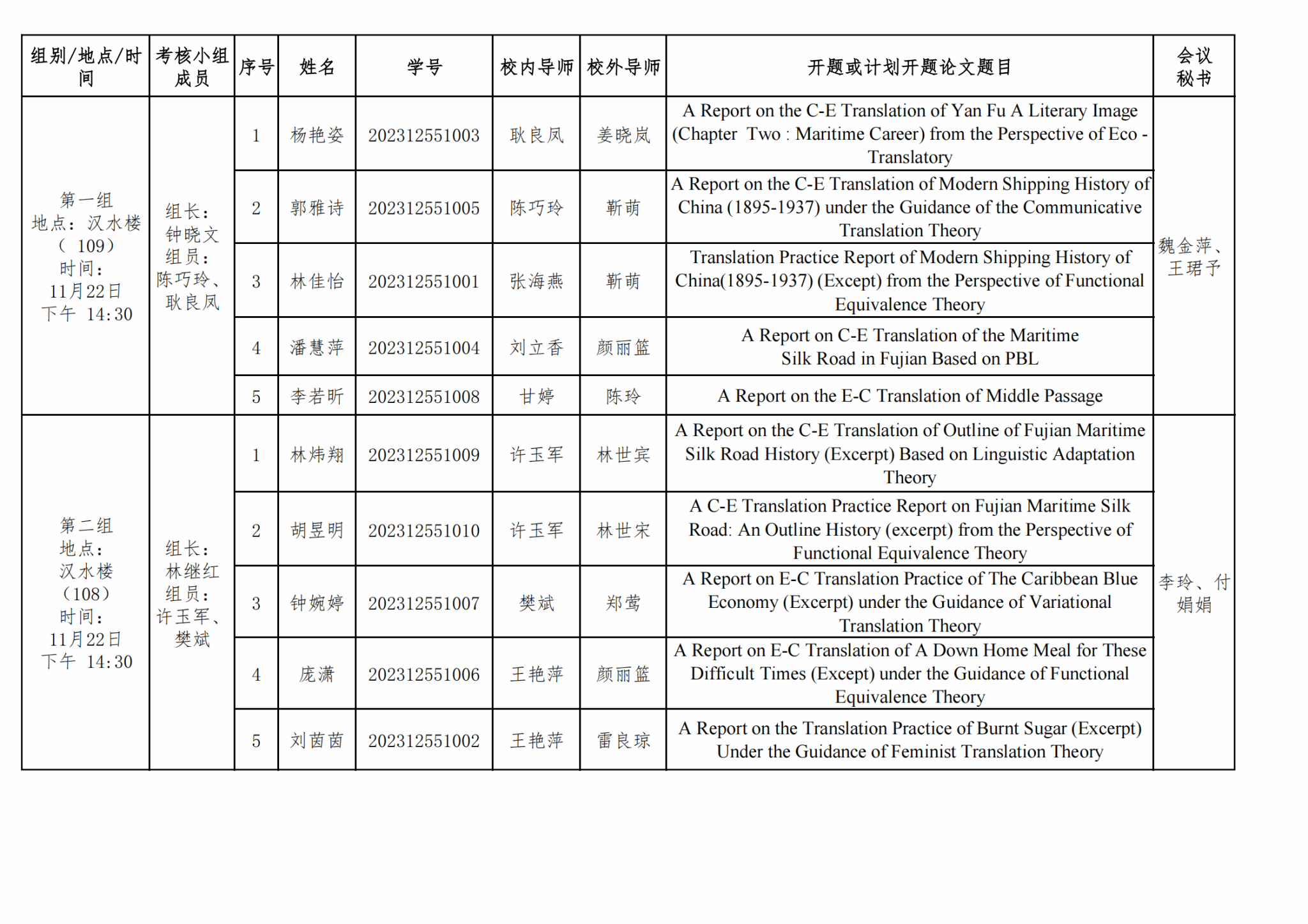 外国语学院将于 2024 年 11 月 22日进行 2024 年下半年笔译专业硕士研究生学位论文中期报告工作,本次设置两个考核组,具体情况如下: